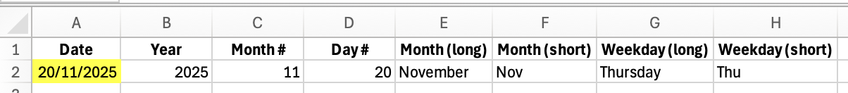 Good news: Excel can split any date into year, month, day, and even the weekday name for you, fully automatically.