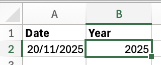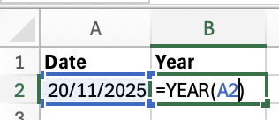 If your date is in cell A2, then use: =YEAR(A2). This will return a four digit year, for example 2025. This can be useful for creating annual reports, sorting invoices or tasks by year, or breaking down data.