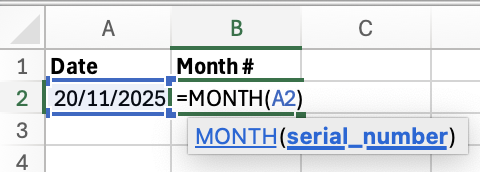 2. Extract the Month Number: =MONTH( )