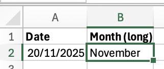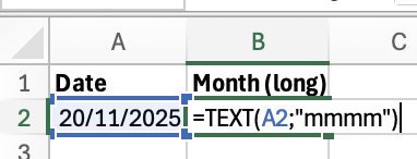 3. Extract the Month Name: =TEXT()