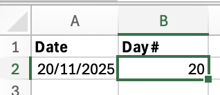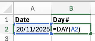 4. Extract the Day: =DAY( )