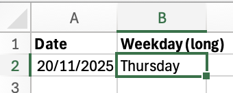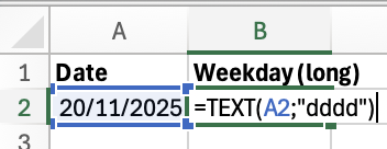 5. Get the Weekday Name: =TEXT( )