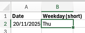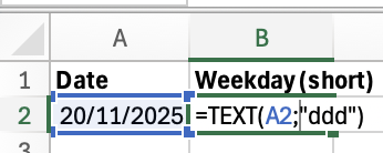 Similarly, in order to extract the short version of the date use: TEXT(A2;"ddd"). For example, this will return "Mon".